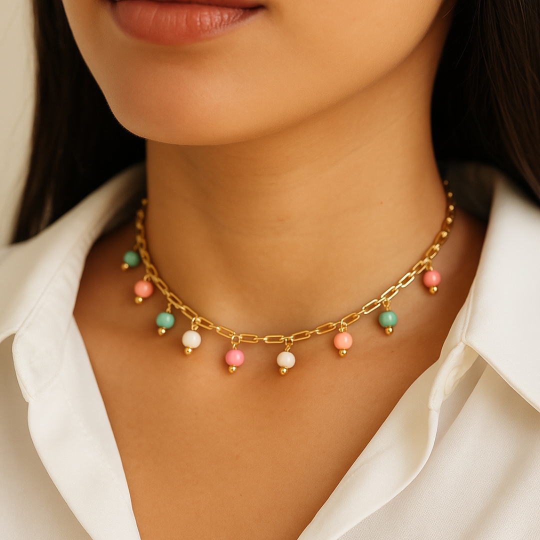 Handmade with a golden chain and delicate pastel-toned beads, this necklace is perfect to bring a youthful and elegant touch to any outfit.