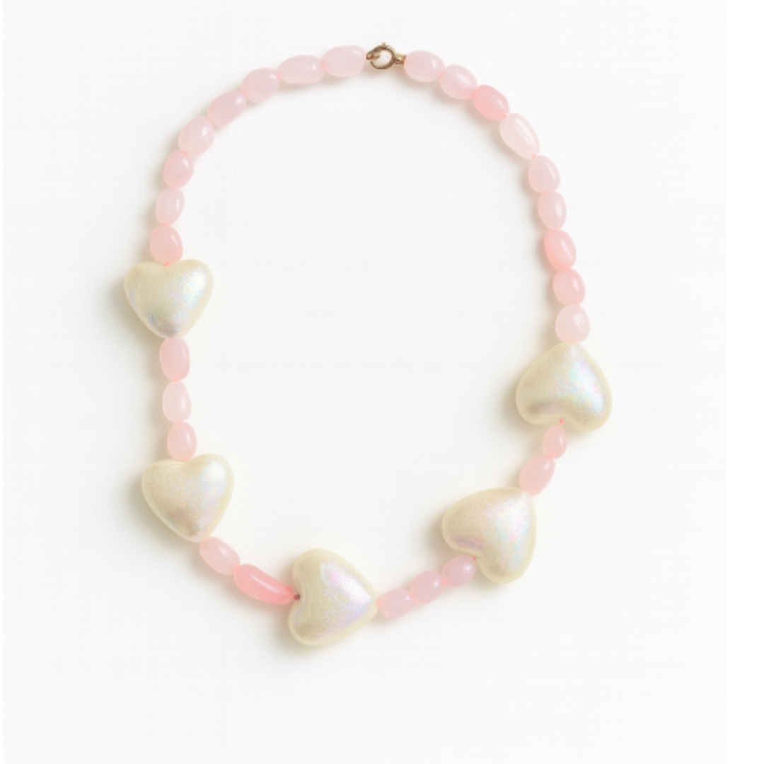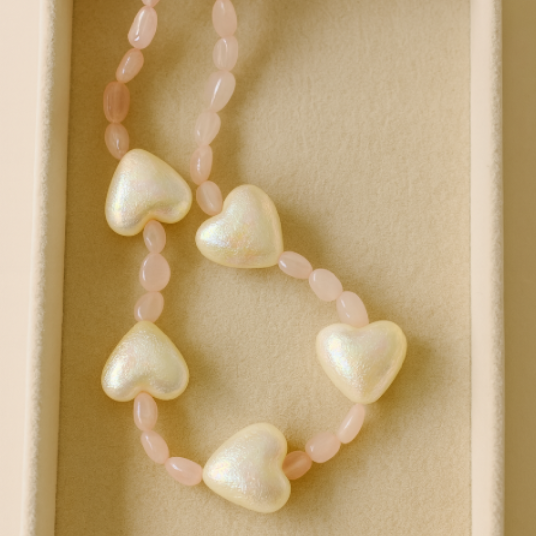 Each pearly heart reflects light with a soft iridescent glow, while the rose quartz beads known for attracting love, calm, and emotional balance infuse the design with subtle positive energy.