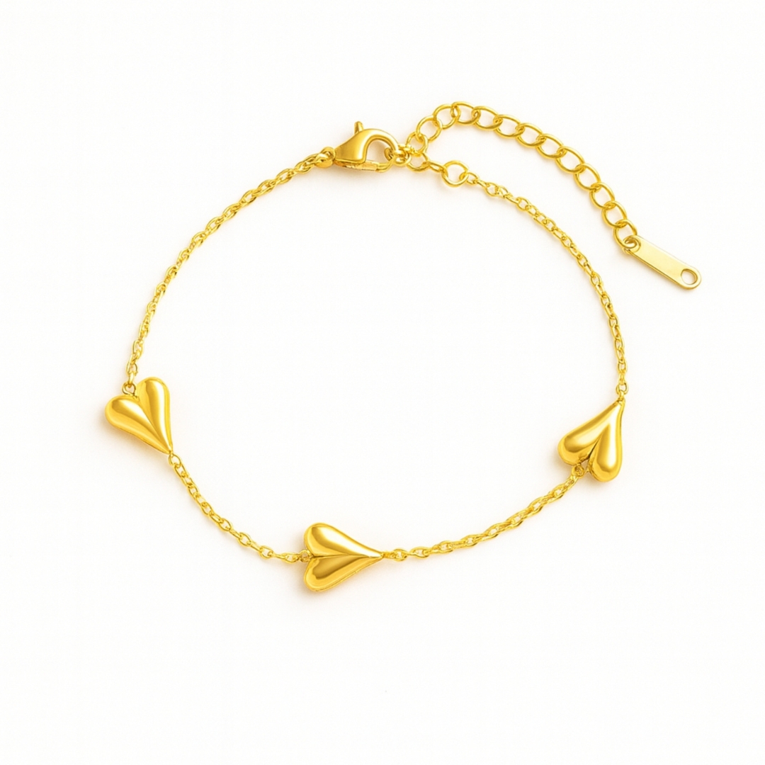 Design: Three polished gold hearts representing love, unity, and elegance.
