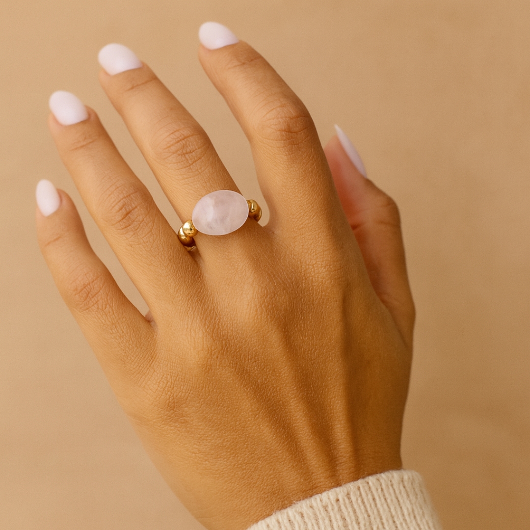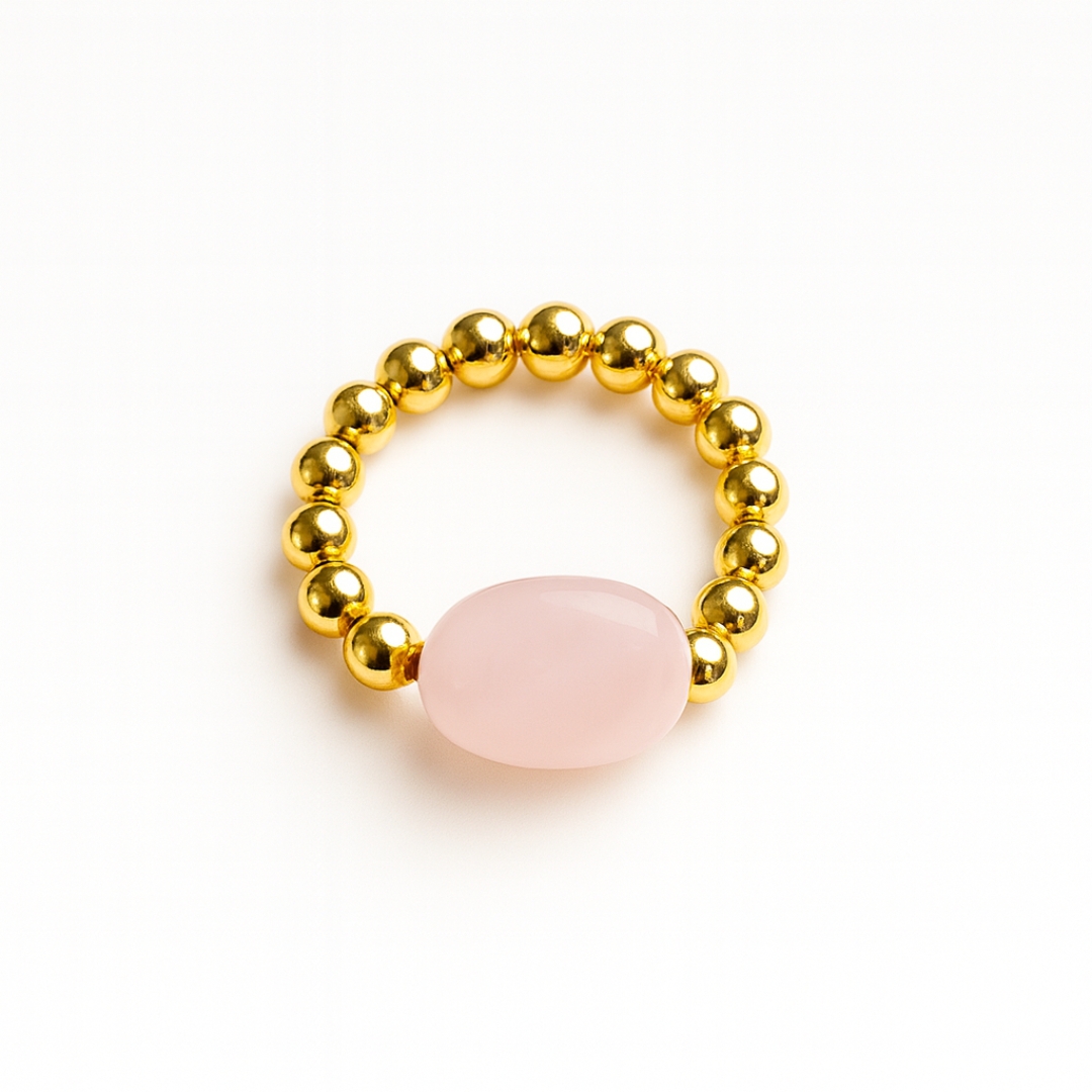 This natural rose quartz love ring with golden beads is much more than an accessory.