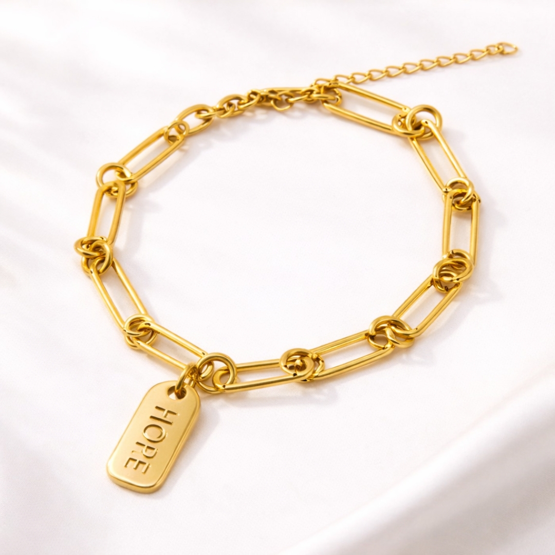 Gold Hope Bracelet with an engraved “HOPE” charm, designed to remind you of the importance of faith and hope in every step of your journey. Crafted in high-quality stainless steel, it is water-resistant and tarnish-proof, maintaining its shine over time. Adjustable for a perfect fit, it blends minimalist elegance with a powerful message. Ideal as an inspiring gift or to wear every day as a symbol of strength and optimism.