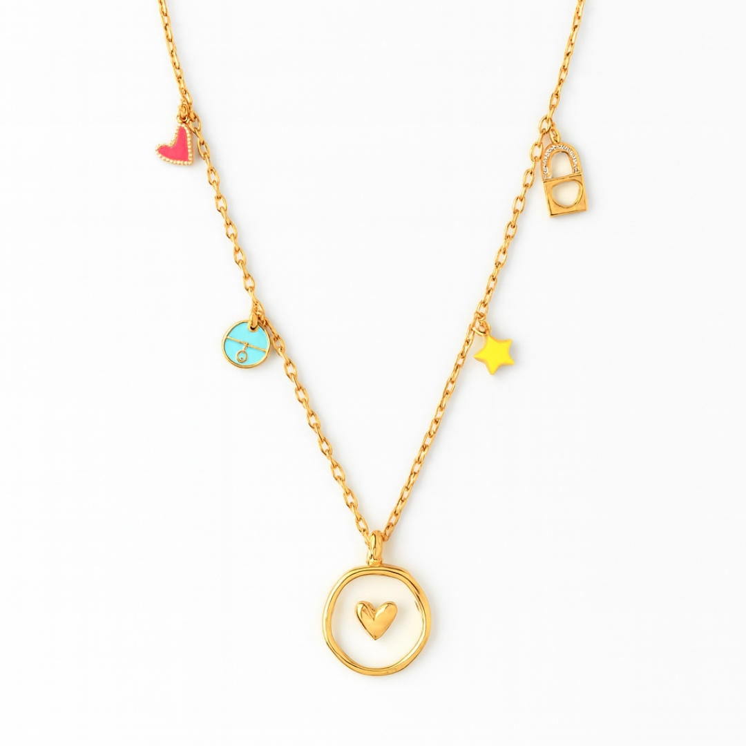 Candado dorado con corazón, Corazón rosa, Dije azul “Smile”, Dije redondo blanco, Estrella amarilla